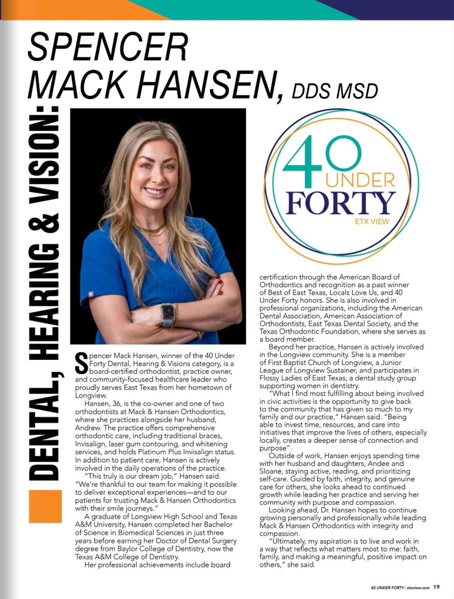 Our Dr. Mack was also recently voted as the winner in the dental category in the ETX View Magazine’s 40 under 40 for the 2nd Time.